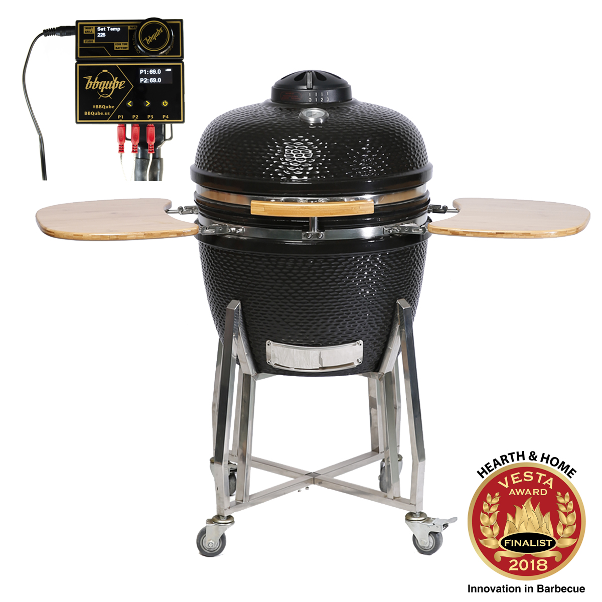 品牌 慢烤大师 型号 BBQ-KMD-22 温控 TempMaster Portable BLE 材料 高温陶瓷 颜色 亮釉红色,亮釉黑色 尺寸 22.4"*27.4"/57*69.5CM 烹饪面积 697 Sq in /1771 cm² (双层烤网) 烤盘直径 φ18.7”/ 47.5cm 重量 105KG 包装尺寸 72x65x103cm 适用人数 4-10人